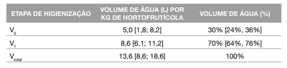 Na Tabela 3 consta o volume médio de água (por kg de hortofrutícola) utilizado na desinfeção dos hortofrutícolas em estudo. A lavagem com água potável (V0) dos hortofrutícolas correspondeu em média a 5,0 L/kg, o que representa 30% do volume total da água utilizada. Por outro lado, a desinfeção com enxaguamento (V1) consumiu um valor médio de 8,6 L/kg, o que representa 70% do volume total da água utilizada.