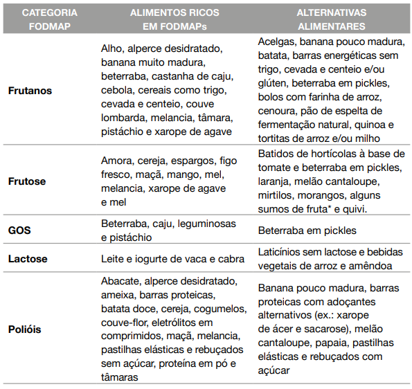 Em atletas de endurance com sintomas gastrointestinais induzidos pelo exercício, pode ser também necessário restringir a ingestão de alimentos ricos em FODMAPs no período pós-exercício, o qual é essencial para proporcionar um ótimo aporte de nutrientes após o exercício, especialmente em períodos de treino intenso (25).