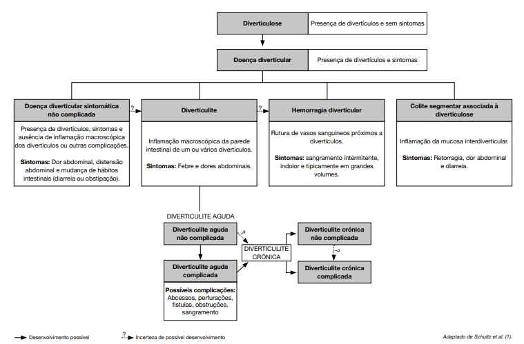 Os doentes com diverticulite aguda não complicada são tratados maioritariamente em ambulatório, na ausência de sépsis, comorbidades significativas ou imunossupressão (38). Apesar da escassa evidência científica, tradicionalmente é utilizada uma dieta com baixo teor de fibra (<10 g/dia) para diminuir a frequência e o volume de fezes, visando facilitar a passagem no local com inflamação (44). No entanto, estudos recentes têm demonstrado que quando tolerada a adoção de uma dieta sem restrições é segura (1, 45). Doentes imunocompetentes e sem sinais de sépsis não devem fazer antibioterapia (46). Já nos casos mais graves de diverticulite não complicada, os doentes devem iniciar fluidos e antibióticos endovenosos. Após o tratamento conservador, os sintomas normalmente melhoram dentro de 2 a 3 dias, podendo-se retomar uma dieta sólida (44).