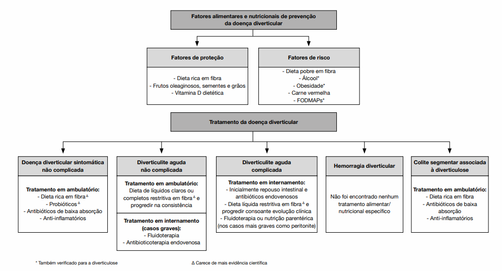 A alimentação é um fator modificável que assume um papel importante no desenvolvimento da diverticulose e da DD, embora seja uma condição multifatorial havendo também o contributo de outros fatores modificáveis e não modificáveis (como idade, sexo e genética). Foram encontrados mais estudos a relacionar os cuidados alimentares e nutricionais com a prevenção da DD do que com o desenvolvimento da diverticulose. De facto, todos os fatores abordados carecem de mais investigação, ainda que em dimensões diferentes. No entanto, a evidência apresentada permite identificar um possível papel positivo da ingestão de fibra e de vitamina D. Assim como do consumo de frutos oleaginosos, sementes e grãos. A ingestão de álcool aparenta ter um papel negativo. O mesmo se verifica para o consumo de carnes vermelhas. Também foi constatada pouca evidência científica relativamente ao tratamento nutricional a adotar nos diferentes subtipos de DD. São, por isso, necessários mais estudos, com desenhos metodológicos mais robustos e em diferentes populações, nomeadamente na Europa. Trabalhos futuros poderão focar-se em avaliar separadamente os efeitos da fibra solúvel e insolúvel tanto na prevenção como tratamento, bem como explorar o papel de outros alimentos ou nutrientes que, pelo potencial anti- -inflamatório, hipotetizamos ter efeito positivo: peixe, abacate, azeite, frutos vermelhos, suplementação com ómega-3, suplementação com glutamina, entre outros. Também seria útil explorar a utilização de nutrição artificial por via entérica de forma exclusiva ou complementar a uma dieta pobre em fibra, nos casos de diverticulite complicada, dado que a mesma tem demonstrado ser vantajosa nas doenças inflamatórias intestinais (51).