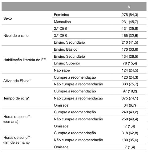 A amostra é constituída por 506 alunos com idades entre os 10 e os 19 anos (média = 14,1; dp = 2,5), sendo que 54,3% são do sexo feminino (Tabela 1). Um quarto dos participantes frequentam o 2.º CEB, 32,6% o 3.º CEB e 41,5% o ES. A maioria dos inquiridos não cumpre as recomendações da OMS relativamente à prática de atividade física (75,7%) e ao tempo de horas de ecrã (74,1%)(40). Em relação às horas de sono, verifica-se uma maior proporção de alunos que cumpre as recomendações ao fim-de-semana (62,8%) em comparação com os dias da semana (49,2%)(41). Verificou-se que cerca de um quarto dos alunos inquiridos (24,5%) não sabe qual é a habilitação literária do EE e que apenas 15,4% dos EE têm algum grau de ensino superior (Tabela 1). No que diz respeito aos hábitos alimentares, verifica-se que 47,8% dos participantes têm uma elevada adesão ao PAM, 47,2% adesão moderada e apenas 4,9% têm baixa adesão, correspondendo a uma pontuação média de 7,3 (dp = 2,3). Os dados do índice de consumo de AUP revelam uma pontuação média 21,8 (dp = 4,8), sendo a pontuação mínima de 7 e a máxima de 33.
