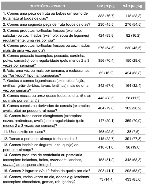 Das respostas dos inquiridos no Índice KIDMED, destacam-se positivamente a utilização de azeite em casa (92,5%); o consumo diário de arroz ou massa (88,5%); o consumo, pelo menos uma vez por dia, de hortícolas (83,8%); e o consumo de laticínios ao pequeno-almoço (81,0%). O consumo de doces e guloseimas várias vezes ao dia e de fast-food pelo menos uma vez por semana é baixo (14,4% e 16,2%, respetivamente). Salientam-se como aspetos negativos das respostas ao Índice KIDMED, a toma diária do pequeno-almoço (22,7%); o consumo de frutos oleaginosos com regularidade (29,1%). Verifica-se ainda uma grande proporção de crianças e adolescentes que não consomem com regularidade pescado (29,6%) (Tabela 2).