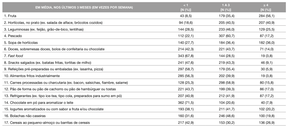 Das respostas no índice de consumo de AUP, revela-se preocupante o consumo frequente de doces, sobremesas doces, bolos de confeitaria ou chocolate, de carnes processadas ou charcutaria, de bolachas não caseiras, de refrigerantes; e o consumo pouco frequente de pescado, de leguminosas, sopa de hortícolas e de hortícolas no prato (Tabela 3).