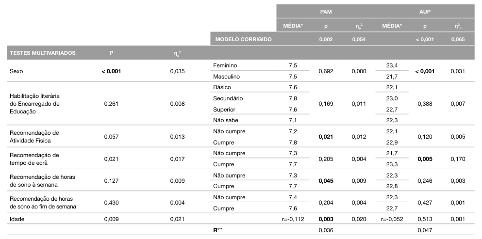 O conjunto de variáveis independentes explica significativamente a adesão ao PAM (η2 p = 0,054; p = 0,002) e o consumo de AUP (η2 p = 0,065; p < 0,001), apesar de a proporção de variância explicada ser inferior a 5% para ambos (3,6% e 4,7%, respetivamente) (Tabela 4). Das variáveis analisadas, é o sexo que mais explica as duas variáveis, em particular o consumo de AUP, sendo que as raparigas são as que têm menor consumo destes alimentos. Segue-se a idade, com significado sobretudo na adesão ao PAM, sendo que os mais velhos tendem a aderir menos a este padrão alimentar. A recomendação de tempo de ecrã também tem um efeito significativo no consumo de AUP, sendo os que não cumprem a recomendação os que mais consomem este tipo de alimentos (Tabela 4).
