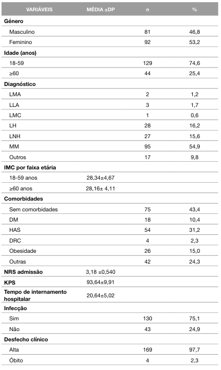 A amostra total foi composta por 173 pacientes, maioria do género feminino (53,2%, n=92), com idade média de 49,84± 13,89 anos e maior prevalência de mieloma múltiplo (MM) (54,9%, n=95), como diagnóstico de base. A média do IMC foi de 28,34±4,67 para os adultos e 28,16± 4,11 para os idosos. Observou-se que 56,6% (n=98) dos pacientes possuíam pelo menos uma comorbidade, sendo a HAS a mais frequente, com prevalência de 31,2% (n=54). Quanto aos dados clínicos, a média da triagem NRS (2002) foi de 3,18 ±0,54, o escore de KPS foi em média de 93,64 ±9,91. A maioria, 75,1% (n=130) dos pacientes, apresentou algum tipo de infecção durante o período de internamento e 2,3% (n=4) faleceram. O tempo médio de internamento foi de 20,64 ±5,02 dias (Tabela 1).