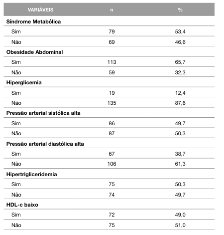 Em relação às variáveis que compõem os critérios de diagnóstico da SM, entre aqueles que possuíam as informações necessárias para o diagnóstico de cada componente, encontrou-se as seguintes prevalências: CC elevada em 65,7% (n=113) dos pacientes, hipertrigliceridemia em 50,3% (n=75), pressão arterial sistólica elevada em 49,7% (n=86), HDL-c baixo em 49% (n=72), pressão arterial diastólica elevada em 38,7% (n=67) e hiperglicemia em 12,4% (n=19) (Tabela 2).