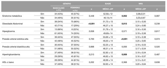 A presença de obesidade abdominal foi associada ao género feminino (p< 0,001). Adicionalmente, foi encontrado significativamente, maior média de idade no grupo de pacientes diagnosticados com SM, obesidade abdominal, pressão arterial sistólica alta e hipertrigliceridemia (p< 0,05) (Tabela 3).