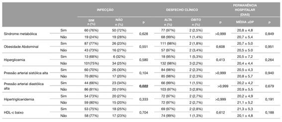 Na análise da existência de interação da SM, e seus componentes, com infecção, desfecho clínico (alta ou óbito) e tempo de permanência hospitalar, apenas a presença infecção durante o internamento foi associada significativamente, a pressão diastólica alta (p= 0,022) (Tabela 4).