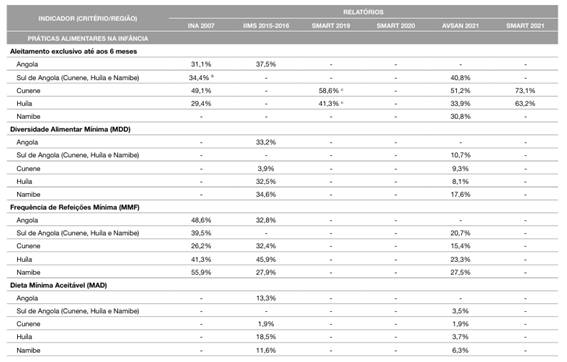 No IIMS 2015-2016 salienta-se que, nas 3 províncias, cerca de 3 em cada 10 crianças atingiram os critérios da MDD e MMF, exceto no Cunene, onde apenas 3,9% cumpriu as recomendações da MDD (18). Em relação à MAD, na Huíla e no Namibe menos de 2 em cada 10 crianças alcançaram os critérios, e no Cunene apenas 1,9% atingiu (18). No AVSAN 2021 destaca-se ainda que, em toda a região, apenas 3,5% das crianças atingiram os critérios da MAD (22).