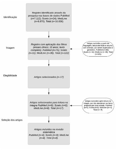 Para esta revisão, foram selecionados artigos publicados até 10 anos atrás e, inicialmente, foram encontrados 16.006 estudos. No entanto, após a aplicação dos critérios de inclusão e exclusão, 8 artigos foram analisados e o processo de triagem foi descrito na forma de um f luxograma (Figura 1). As doses suplementadas variaram de 300 mg a 1.200 mg de ALA por dia, com um período de intervenção entre 8 e 20 semanas, sendo a amostra mínima de 20 voluntários, enquanto a máxima foi de 103.