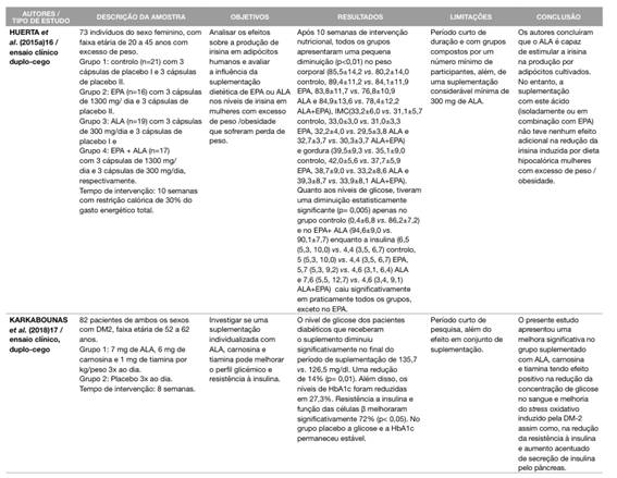 Além disso, o presente estudo também avaliou a suplementação de ALA combinada com marcadores de inflamação que aumentam o risco de desenvolvimento de DCV e encontrou efeitos positivos ao suplementar ALA, 600 mg/dia por 90 dias (15) e 300 mg combinado com uma dieta de baixa caloria por 10 semanas (14). Mohammadi et al. (12), num ensaio clínico duplo-cego, utilizaram suplementação de ALA (600 mg por 12 semanas) em indivíduos com lesão medular e verificaram que não houve diminuição significativa dos marcadores de inflamação, no entanto, o ALA reduziu a glicose sérica em jejum, os parâmetros antropométricos e a pressão arterial no sexo masculino. Mirtaheri et al. (22), após um estudo com suplementação de ALA (1.200 mg, durante 8 semanas) no qual avaliaram seu efeito sobre os níveis de alguns marcadores de inflamação, incluindo fator de necrose tumoral alfa (TNF-α), interleucina tipo 6 (IL-6). A eficácia do ALA no tratamento de algumas doenças inflamatórias com componente de stress oxidativo, como DM2 e neuropatia diabética, foi demonstrada em vários estudos, no entanto, os efeitos foram negativos para ambos. No entanto, um ensaio clínico realizado com indivíduos com doença hepática gordurosa não alcoólica que foram submetidos a uma suplementação de 1200 mg de ALA com 400 mg de vitamina E ou vitamina E isoladamente, mostrou que o grupo piloto alcançou um aumento significativo na adiponectina sérica média e uma diminuição nos níveis de IL-6 em comparação com o grupo placebo. Os autores relatam que essas citocinas inflamatórias estão profundamente aumentadas em indivíduos obesos e podem causar resistência à insulina. O ALA tem propriedades que reduzem citocinas como TNF-α e IL-6, estas citocinas têm a capacidade de aumentar a síntese de proteína C-reativa. Assim, ALA ajuda a reduzir estes processos inflamatórios (23).