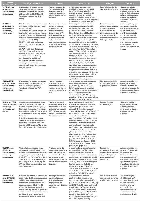 Os estudos mostraram um efeito positivo na suplementação de ALA em pacientes com excesso de peso, com ou sem DCV. Os resultados estão descritos na Tabela 1. Foram observadas redução de peso (10 13), redução de marcadores de inflamação que aumentam o risco de desenvolvimento de DCV (14, 15) e redução dos níveis plasmáticos de glicose (10, 16, 17) e perfil lipídico (10), enquanto outros estudos não mostraram efeitos significativos na redução de peso e/ou DCV (14, 16).