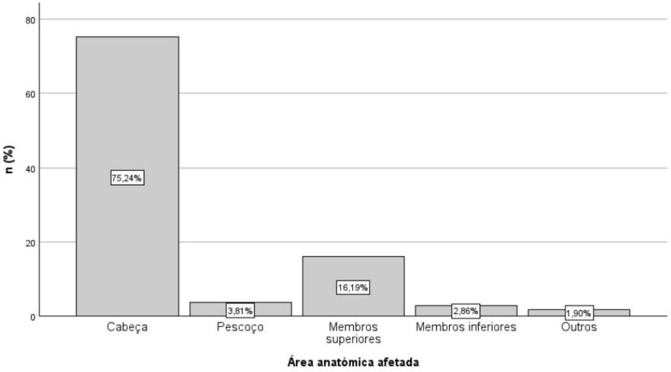 No total foram diagnosticadas 105 lesões cuja distribuição topográfica corresponde a áreas do corpo mais expostas à radiação UV: couro cabeludo (n=23; 22%), pavilhões auriculares (n=15; 14%) e mãos (n=8; 7%)(22) (23).