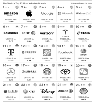 Além disso, as marcas titularizadas pelas Big Techs, por si só, são muito valiosas. Um relatório apresentado pela consultoria Brand Finance, no Fórum Econômico Mundial de Davos, de 2023, demonstra que, dentre as vinte e cinco marcas mais valiosas do mercado global, cinco se referem a plataformas digitais (Amazon, Google, Microsoft, TikTok e Facebook), ao passo que ao menos dez delas são de titularidade de empresas de base tecnológica12. Adicionalmente, a primeira, a segunda, a terceira e a quarta posições no ranking são ocupadas por Big Techs, a saber, Amazon, Apple, Google e Microsoft, respectivamente: