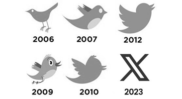 Em 2022, o também controverso bilionário Elon Musk adquiriu a rede social Twitter, focada em textos curtos para a divulgação de ideias e notícias, preferida de jornalistas e acadêmicos, por R$ 44 bilhões de dólares42. Em 2023, dentre várias outras mudanças radicais na governança do Twitter, Musk também surpreendeu o mercado global ao modificar a marca, antes um simpático passarinho azul, substituída pela marca X, uma única letra em fonte com linhas retas e pretas43. Abaixo, ilustra-se a evolução da marca: