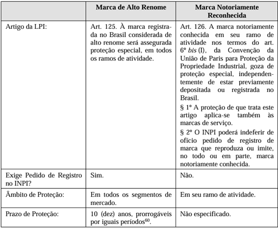 A distinção entre marca de alto renome e marca notoriamente conhecida é relevante para a compreensão deste estudo. No quadro esquemático abaixo, é possível entender a distinção de forma resumida: