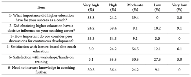 In relation to deepening knowledge in training, there is a largely significant expression of this need amongst coaches, with some intensification in this perception, however, of varied gradients. In general, the results reveal an appreciation of the value of education investment, with professionals seeking to implement ways that enable life-long learning and professional experience sharing.