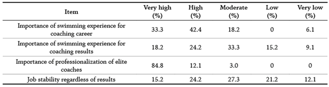 In terms of the perceived impact this experience had on coaching success, the participants scored responses from high to moderate and low importance, indicating heterogeneous views in relation to the transfer of expertise from the swimmer environment to the coaching environment.