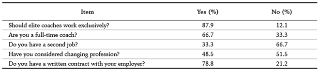 The data presented in Table 4 show distinct dimensions concerning professionalization, stability, and commitment to the activity of elite coaching.