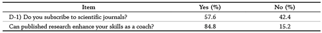 Based on the information in Table 5, it can be concluded that the majority of coaches realize the value of research to their professional improvement and view the contribution of science positively to the improvement of sports practice. Regarding subscriptions to scientific journals in the area of sports sciences, a significant percentage of the coaches do not get subscriptions to specialized journals, which could suggest a limitation in accessing current scientific information on a regular basis. However, most believe that scientific knowledge in print could help with their coaching skills.