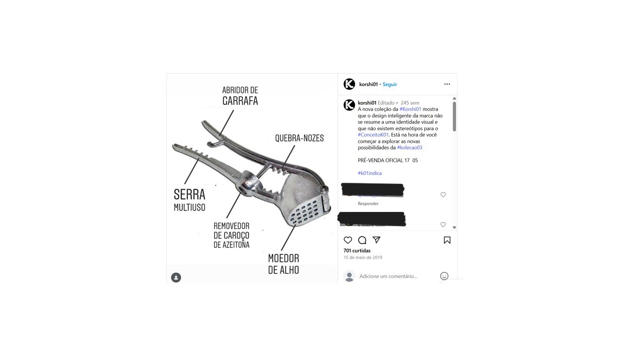 Fonte. Retirado de A nova coleção da #Korshi01 mostra que o design inteligente da marca não se resume a uma identidade visual [Post], de KORSHI 01, 2019, Instagram. (https://www.instagram.com/p/Bxf2xqnJ4G/?igsh=eXd1czJicWp2cnh5)