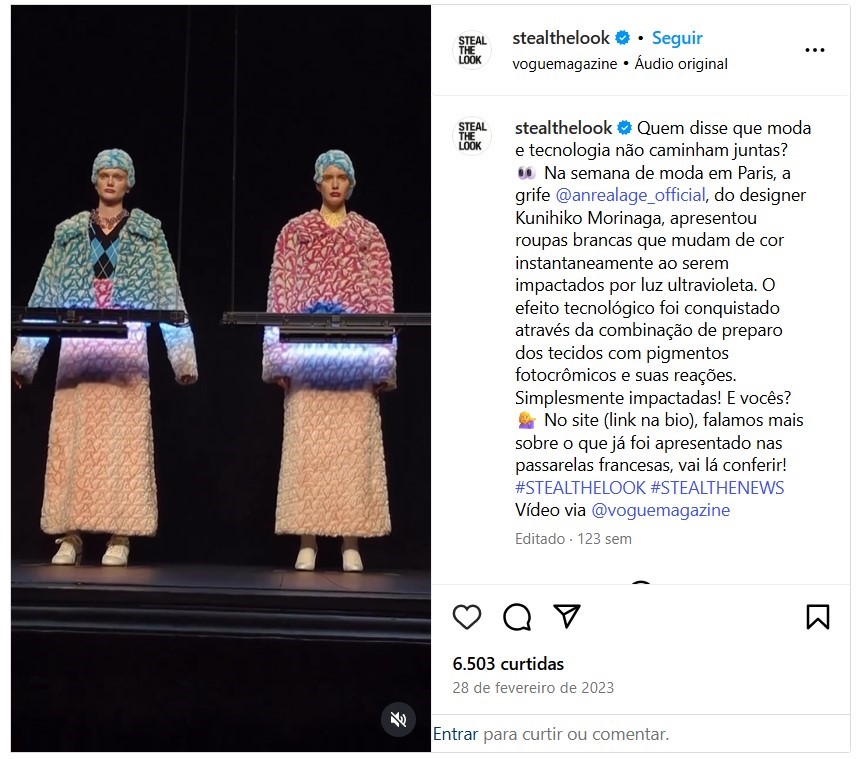 Fonte. Retirado de Quem disse que moda e tecnologia não caminham juntas? Na semana de moda em Paris, a grife @anrealage_official, do designer Kunihiko Morinaga [Vídeo], de Steal the Look, 2023, Instagram. (https://www.instagram.com/reel/CpOLq5JJSdG/)
