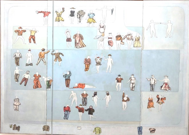 A pintura The Planetarium, de Öyvind Fahlström (1963; Figura 4), ilustra de forma interessante o conceito de “modularidade” na moda. A obra apresenta figuras humanas vestidas com diferentes combinações de peças, evidenciando a possibilidade de criar infinitas variações a partir de um conjunto limitado de elementos.