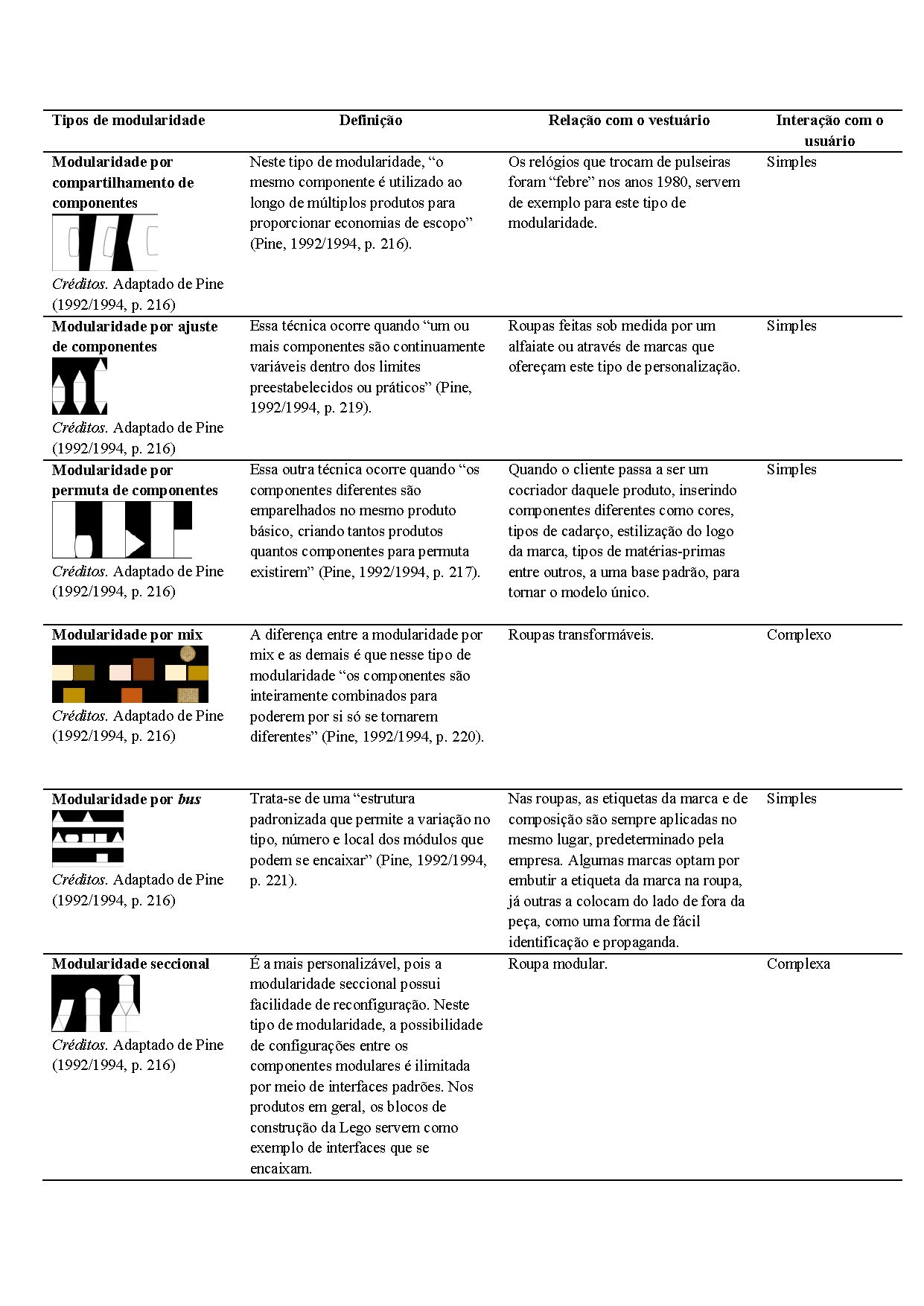 A Tabela 1 apresenta uma comparação entre os tipos de modularidade propostos por Pine (1992/1994) e sua relação com as roupas reconfiguráveis. Observa-se que a modularidade por mix e a modularidade seccional apresentam maior similaridade com as roupas transformáveis e modulares, respectivamente.
