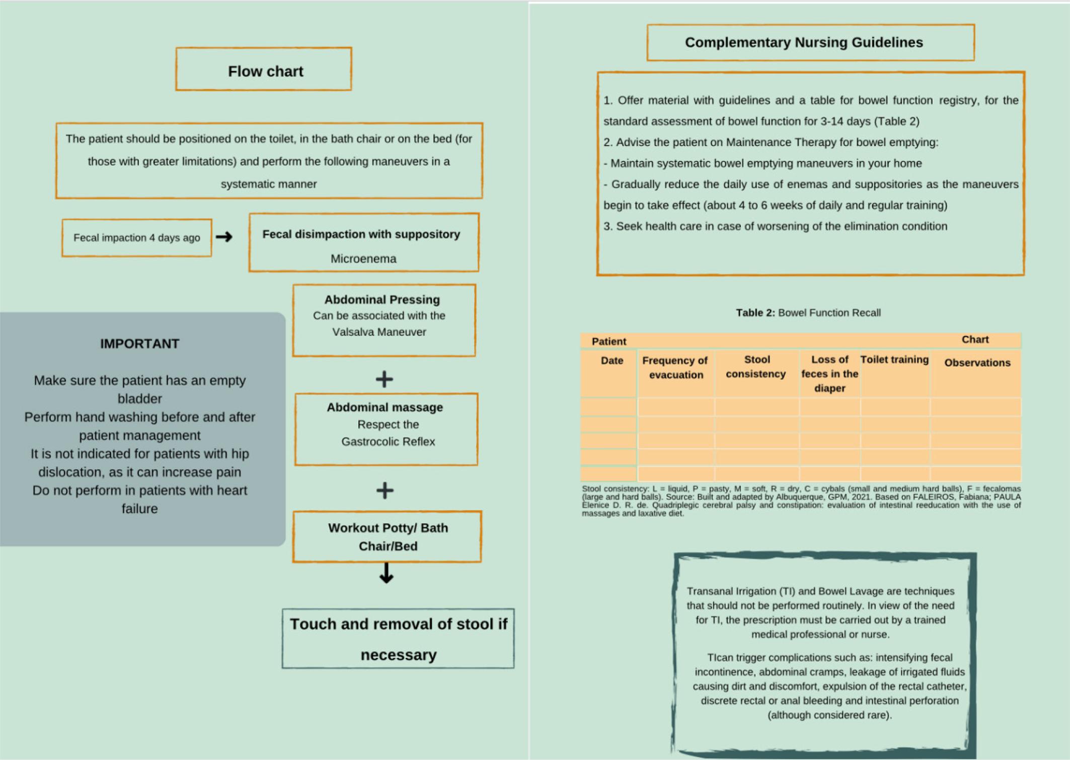 Educational materials created and validated by the Neuropsychomotor Rehabilitation Research and Care Centre (Neurorehab) at EERP-USP for neurogenic bowel were consulted as a basis for structuring the proposed guidelines and the care offered by nurses, available at the following link: http://eaulas.usp.br/portal/video.action?idItem=8104