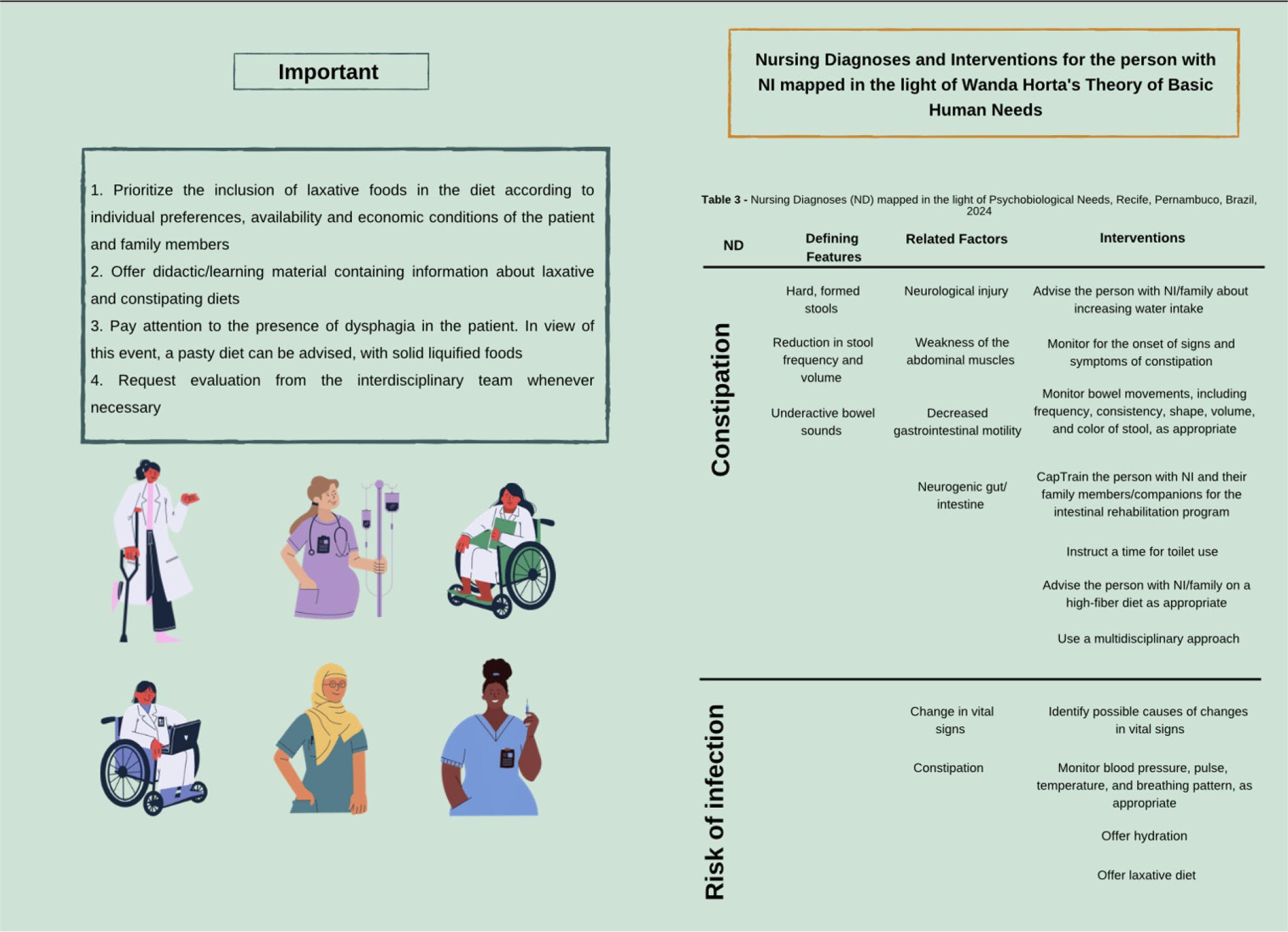 To intensify the process of interaction between nurses and patients, the Bristol Scale, characterized by the assessment of stool consistency, and a Bowel Function Recall model 13 were inserted, together with guiding questions about diet, water intake and physical activity, to enable interaction and dialogue between nurses. Collaborating with learning and strengthening nursing care, at the end of the protocol, the table containing the diagnoses, defining characteristics, related factors and nursing interventions mapped in the light of Wanda Horta's Theory of Psychobiological Needs was inserted (Figures 4).