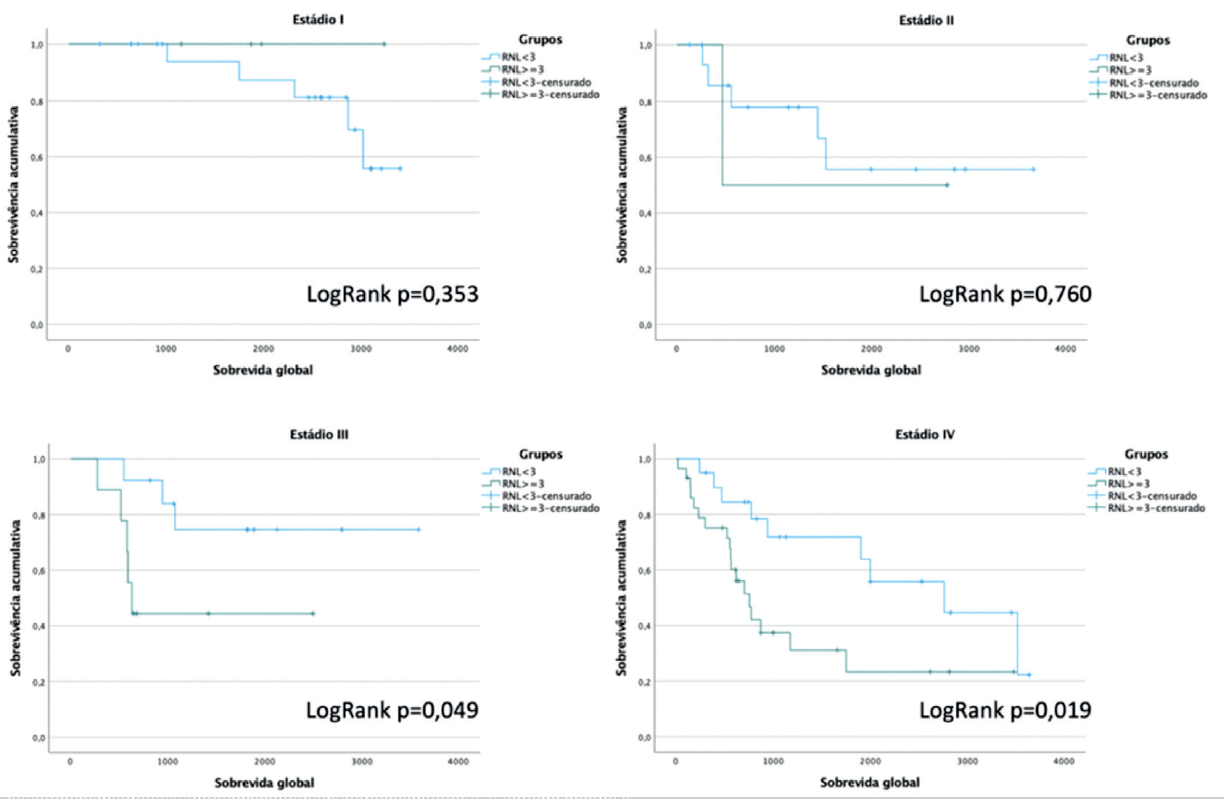 Quando comparámos, utilizando as curvas de Kaplan-Meier, os grupos de doentes com RNL menor que 3 e doentes com RNL maior ou igual a 3, subcategorizados por estádio, obtivemos resultados estatisticamente significativos para os estádios mais avançados, III e IV, com p=0,049 e p=0,019, respetivamente, no teste de Log-Rank (figura 1), mas não obtivemos resultados significativos para os estádios precoces.