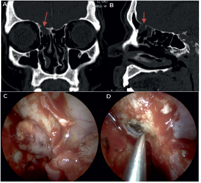 Figuras Caso clínico de meningoencefalocelo espontâneo da transição da parede posterior do seio frontal para a fóvea etmoidal direita. A e B. TC-SPN pré-operatória (seta - defeito ósseo); C. imagem intra-operatória da herniação; D. campo cirúrgico após redução com cauterização bipolar e exérese, destacando a importância da identificação do limite ósseo do defeito em toda a circunferência e o descolamento da dura na face intracraniana para permitir a colocação de material de reconstrução underlay