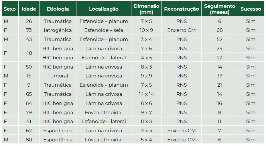 As etiologias foram hipertensão intra-craniana benigna (n=6), traumática (n=5), das quais acidentais em 4 casos e iatrogénica no outro caso (abordagem trans-selar com resseção de macroadenoma da hipófise), espontânea (n=2) e tumoral (n=1), no contexto de displasia fibrosa. As localizações mais frequentes foram a lâmina crivosa do etmoide (n=6) e o seio esfenóide (n=6, três no planum, dois na na parede lateral e um na região selar), seguida da transição da tábua posterior do frontal para a fóvea etmoidal (n=2). A lateralidade foi direita em seis casos, esquerda em seis e central/bilateral em dois. Em relação às comorbilidades, seis doentes eram obesos, sete tinham hipertensão arterial e quatro diabetes mellitus. A caracterização resumida da população é apresentada na tabela 1.