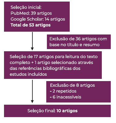 Da pesquisa inicial, realizada conforme explicado previamente, resultaram 53 artigos potencialmente relevantes. Após a aplicação dos critérios de inclusão e exclusão mediante a leitura do título e resumo, foram excluídos 36 artigos. Através da análise das referências bibliográficas dos estudos incluídos, foi obtido mais um artigo para leitura adicional do texto completo, totalizando 18 estudos. Por fim, 8 destes foram excluídos por serem inacessíveis ou repetidos. Assim sendo, a presente revisão sistemática incluiu 10 artigos: 4 revisões narrativas, 3 revisões sistemáticas, 2 séries de casos e 1 coorte retrospetiva. Na figura 1 observa-se o fluxograma da seleção dos estudos. Como se pode observar na tabela 1, que sumaria as caraterísticas dos artigos incluídos nesta revisão sistemática, a maioria dos estudos são muito recentes e incidem sobre a população de mulheres transgénero.