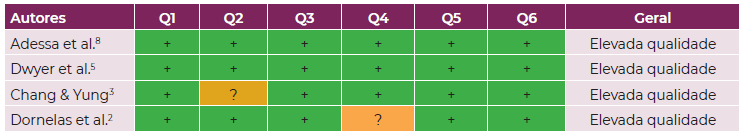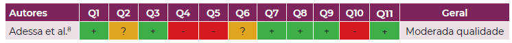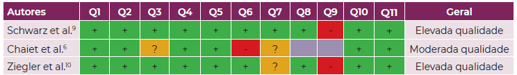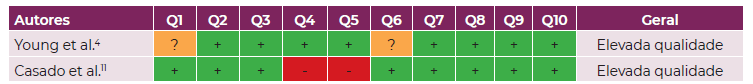 Legenda: Q - Questão; retângulo verde com símbolo “+” - sim (2 pontos); retângulo vermelho com símbolo “-“ - não (0 pontos); retângulo amarelo com símbolo “?” - indefinido (1 ponto); retângulo cinzento - Não aplicável; Os valores de ponto de corte foram: elevada qualidade - 8 a 12 pontos; moderada qualidade - 6 a 8 pontos e baixa qualidade - 0 a 6 pontos.