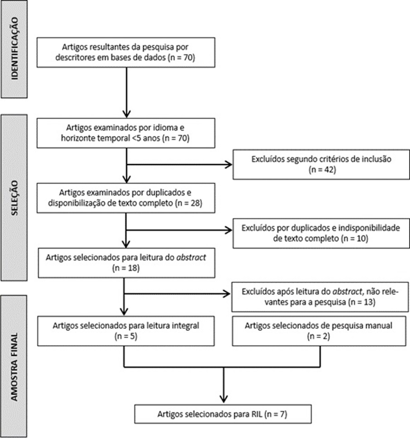 Finalmente alcançaram-se 5 artigos para leitura integral, aos quais se acrescentaram 2 artigos obtidos através de pesquisa manual, culminando em 7 artigos selecionados para a RIL.