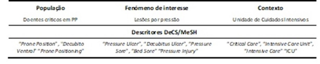A questão de investigação que orientou a pesquisa foi: “Que intervenções para a prevenção de lesões por pressão, no doente crítico, em Prone Position, em Cuidados Intensivos?”. Seguindo as etapas metodológicas propostas por Mendes, Silveira & Galvão (2008), para a construção da questão de pesquisa foi utilizado o acrónimo PCC, através da definição dos participantes, do fenómeno de interesse e do contexto. Na tabela 1. encontram-se os elementos do acrónimo PCC, com os respetivos descritores DeCS e MeSH usados na pesquisa e a partir dos quais se formulou a questão de investigação.