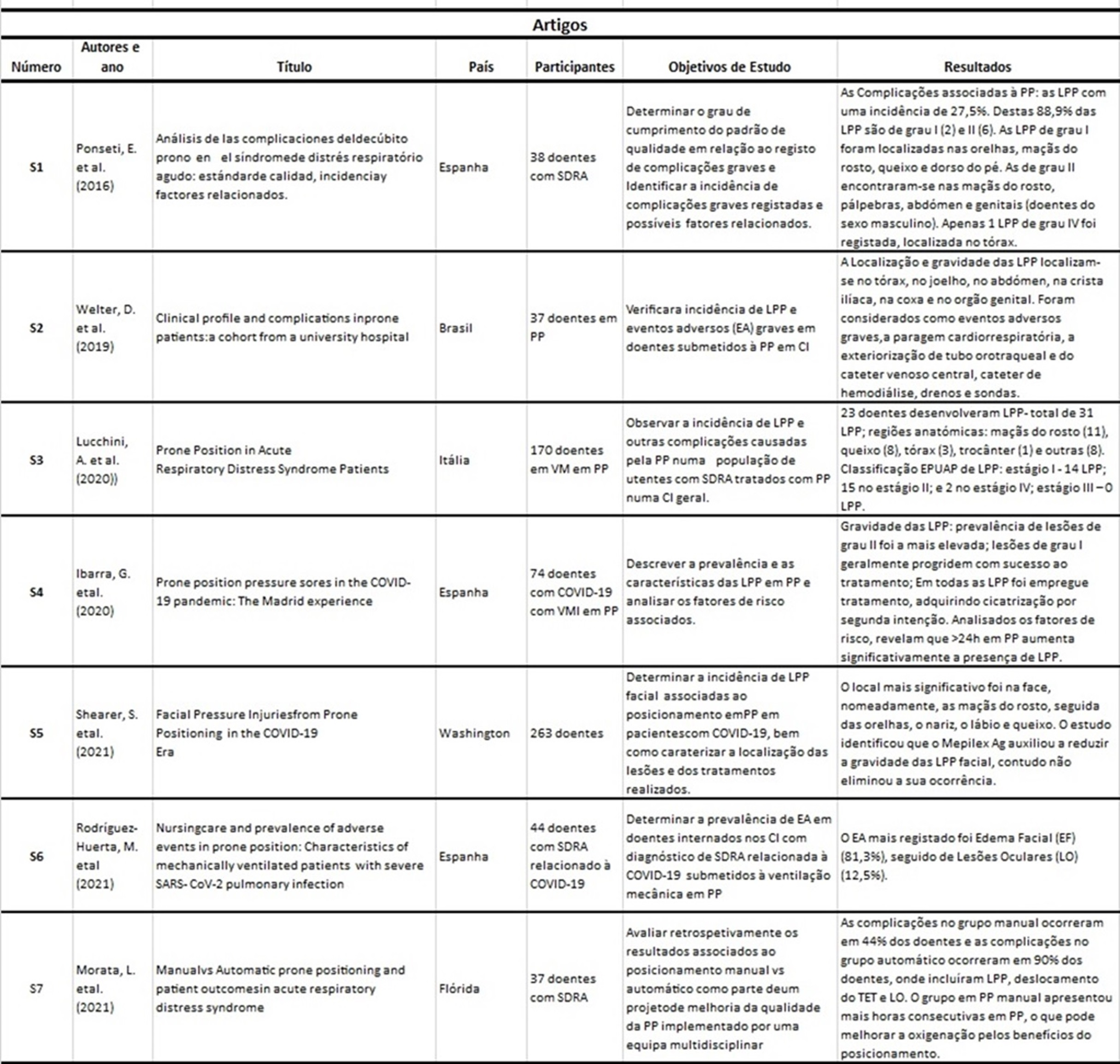 As principais complicações descritas associadas à PP incluem o deslocamento do TOT, reiterado nos artigos S2, S3 e S7, e reforçado por Campayo, Sanz & Fajardo (2020) e Barakat-Johnson et al. (2020). Ainda nesta linha de pensamento, os mesmos autores retratam o risco de extração acidental de outros dispositivos médicos, a regurgitação, citado no artigo S6 e descrito como vómito nos artigos S3, S6 e S7. Também estão descritas como complicações a hipersalivação, a hemorragia, nos artigos S4 e S7, as lesões oculares, em S1, S5, S6 e S7, e o edema facial, descrito em S1 e S6. Campayo, Sanz & Fajardo (2020) reforçam as complicações descritas, especificando o edema na órbita ocular e o edema facial.