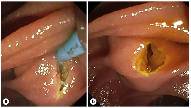 Fig. 1 a Needle-knife is used to perform an incision 3-5 mm from the papillary orifice. b Fistula between the duodenal and common bile duct luminae.