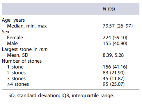 As shown in Table 1, a total of 379 patients were included (n = 224, 59.1% females, mean age 75.10 years [26-97 years]). The stone removal success rate was, globally, 87.1% in the index ERCP. In 56 (14.8%) patients, a repeated ERCP was deemed necessary, and the global success rate for complete stone extraction was 97.9%. Balloon catheters (81%) and wire baskets (45.1%) were used to extract stones. There was a need for advanced stone extraction techniques in 21 patients (5.5%) in the index ERCP and 10.8% in the repeated ERCP.