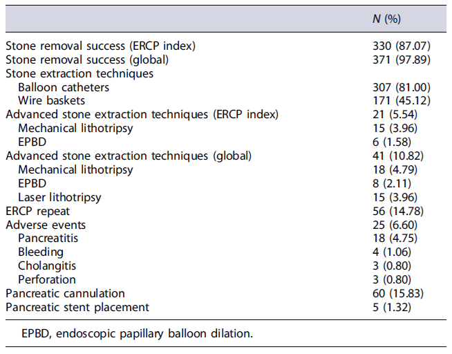 Themainoutcomeswerethe rate ofstoneremovalat baseline ERCP and adverse events. As this study was based on a prospective database, the follow-up of complications was performed in a systematic manner by the investigation team 30 days after ERCP.