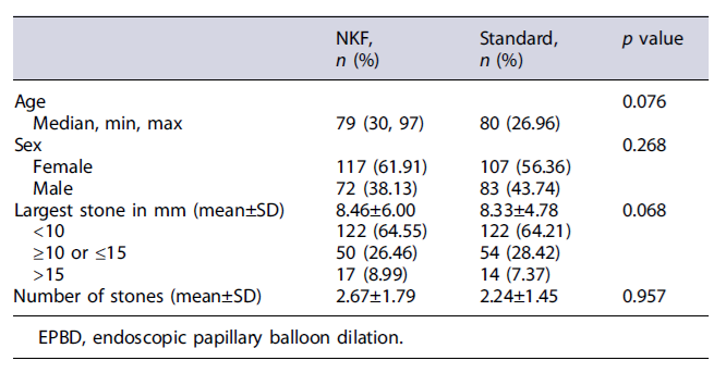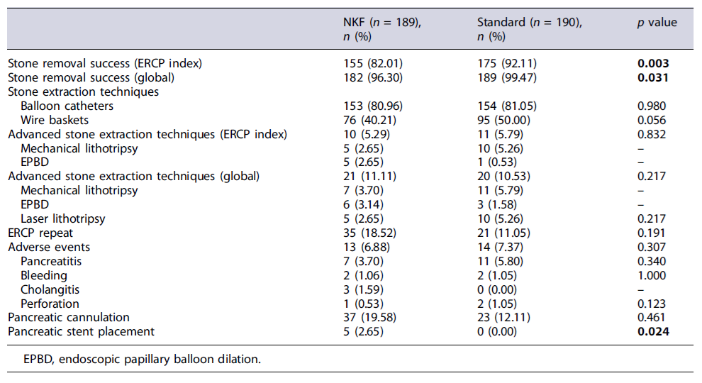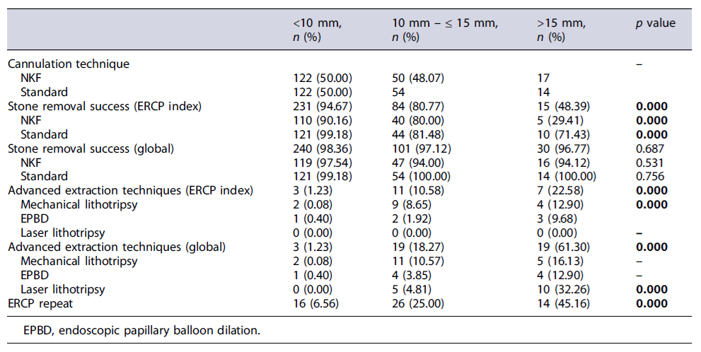 When comparing the two groups, standard cannulation proved to have a higher success rate in stone removal at the index ERCP when compared to NKF, although both techniques demonstrated a high success rate, particularly for stones under 10 mm (>90% success rate). The difference between groups was more pronounced in stones with more than 15 mm, with 29% success rate in the index NKF ERCP and 71% in the standard cannulation group. These data could support our hypothesis that the lower success rate is probably related to a smaller biliary orifice in NKF. However, when including the repeat ERCP (global ERCP success rate), the stone size did not convey a difference. This finding could be attributed to the use of plastic stents after a failed index ERCP and an increased utilization of alternative advanced stone extraction techniques in the repeat ERCP, which might have contributed to overcoming the challenges posed by larger stone sizes, such as the length of sphincterotomy. Our findings suggest that, in patients undergoing NKF, the use of large ballon dilation or a careful extension of sphincterotomy during the first ERCP could potentially enhance its therapeutic effec tiveness and decrease the requirement for repeat ERCP. These observations align with Archibugi et al. [10], who reported that the reintervention rate for chol edocholithiasis was significantly higher in a short term after ERCP by NKF, particularly because of incomplete common bile duct clearing.