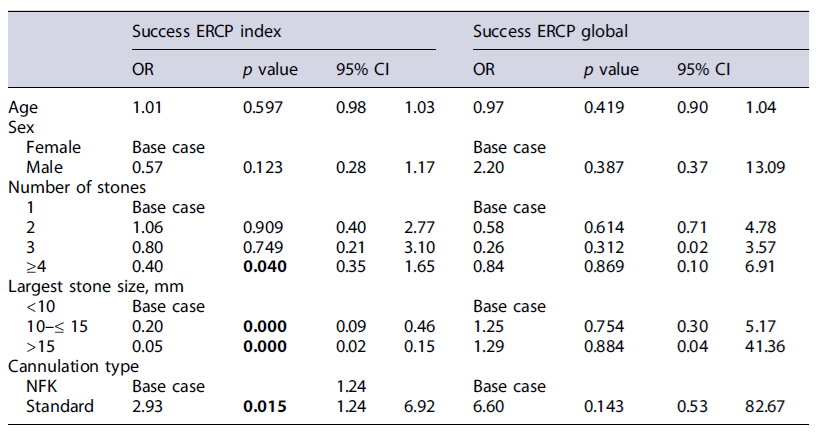 A logistic regression was performed to evaluate predictors of success and adverse events. The model contained 5 independent variables (age, sex, number of stones, largest stone size, and cannulation type) that were selected based on the clinical probability of interfering with the success of the ERCP treatment.