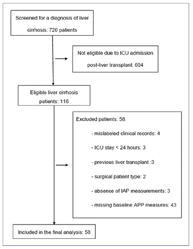 For this study, 720 patients were screened, 116 were found eligible, and the final analysis included 58 patients, as detailed in the patient flowchart (Fig. 1). None of the patients had previous ICU admissions nor contraindi-cation for intravesical IAP measures. The total number of measurements of APP was 527, corresponding to approximately 9 per patient during the study period.