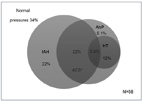 Critical pressures (hypotension, IAH, and AhP) at baseline overlapped as illustrated in Figure 2. The frequency of persisting hypotension, IAH, and AhP were, respectively, 8 (13.8%), 27 (46.6%), and 17 (29.3%).