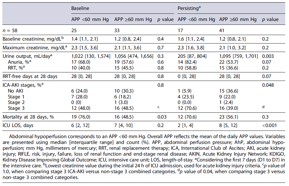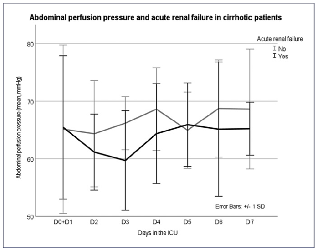In the critically ill patient with cirrhosis, ascites and increased intra-abdominal pressure (IAP) are related to portal hypertension. Abdominal perfusion pressure (APP) is the difference between mean arterial pressure (MAP) and IAP. Abdominal hypoperfusion (AhP) (APP <60 mm Hg) is often overlooked as a potential concomitant mechanism for AKI in the critically ill patient with liver cirrhosis, especially if ascites is present [6]. Even more, paracentesis is a safe therapeutic option to treat intra-abdominal hypertension (IAH), thus optimizing APP and improving organ perfusion [6-10]. This study aimed to analyze the impact of APP on AKI in critically ill patients with liver cirrhosis.