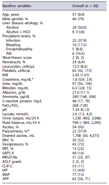 At ICU admission, median MELD-Na score was 31 [19, 20], and mean SAPS II score was 49 (±16) and chronic liver failure consortium (CLIF-C) score was 53 (±11). In total, there were 54 (93%) patients with ACLF criteria at baseline, and the clinical severity distribution was grade 1 in 12%; grade 2 in 26%; and grade 3 (with three or more organ failures) in 55% of cases. During the first 24 h of admission, vital organ support was provided using RRT in 22%, IMV in 52%, and vasopressors in 72%of patients (Table 1).