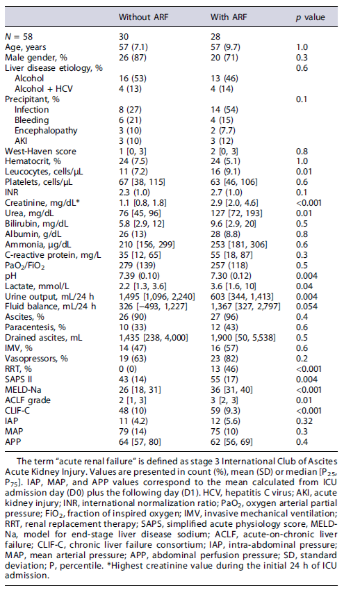 Weacknowledge some limitations: (1) the use of D0 lowest creatinine value as reference for the calculation of AKI criteria may have excluded diagnosis of AKI and ARF already established at baseline; (2) the frequency of contrast-enhanced computed tomography, although uncommonly performed in these patients, was not asserted, nor the subsequent risk for contrast-induced AKI; (3) the relatively small sample size may have been underpowered to detect significant differences in outcomes such as RRT-free days, (4) possible selection bias at ICU admission,sincesomepatients were excluded for not having baseline calculation of APP, and (5) serum creatinine may have under-estimated AKI in these patients with liver cirrhosis, whereas cystatin-C may be a better marker; and finally (6) no specific urinary biomarkers were used to differentiate the etiologies of AKI, including acute tubular necrosis, HRS-AKI, and others since we did not use these in our clinical practice.