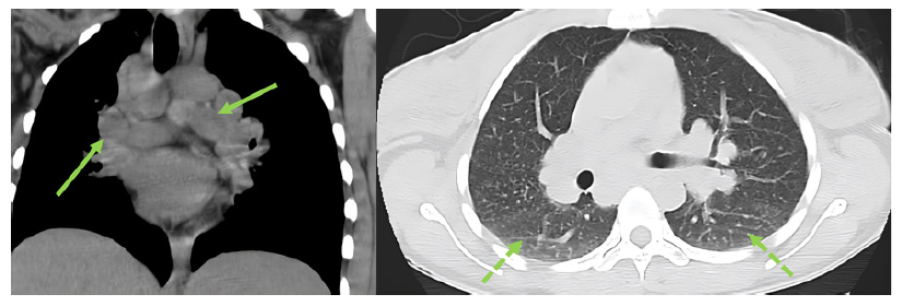 Fig. 1. Thoracic computed tomography revealing multiple mediastinal and peribronchial adenopathies and diffuse interstitial densification pattern at the lung bases (see arrows).