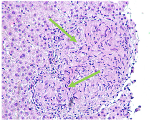 Fig. 2. Liver biopsy revealing multiple epithelioid granulomas located periportally and in the lobular areas, without necrosis (see arrows) immunohistochemical study revealing rare bile ducts, and periportal hepatocytes with an intermediate cell phenotype, suggesting chronic cholestasis.